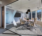清酒墻和洞石溪流中間的通道,引導(dǎo)人走向餐廳深處。順著泉水流向,盡頭處依然是印有神宮標(biāo)識(shí)明亮的燈箱,與一樓的過道相呼應(yīng)。原建筑外墻打通后大片玻璃窗,使得視線得以無限延伸,內(nèi)外空間產(chǎn)生聯(lián)系,外面的高樓夜景也盡收眼底。