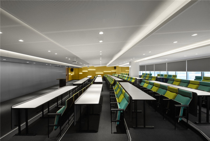 噪音是開放辦公不得不考慮的問(wèn)題,吸音材料的使用也是此次設(shè)計(jì)中的重點(diǎn)。辦公區(qū)天花使用沖孔吸音蜂窩鋁板,電梯廳、走道的墻面及天花均使用陽(yáng)極氧化鋁板,地面則使用地毯,從而有效降低辦公噪音,提高工作效率。