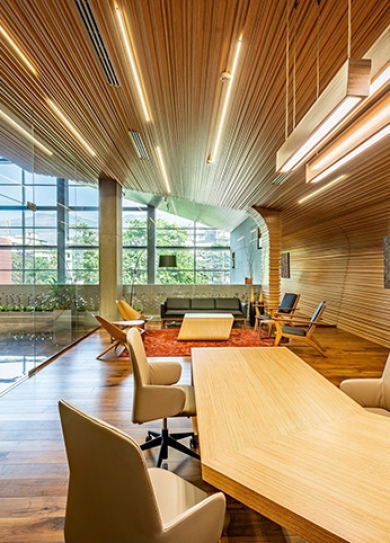 標(biāo)簽: 律師事務(wù)所裝修設(shè)計(jì) 律師辦公室裝修案例 READ MORENarsi & Associates是一家致力于設(shè)計(jì)、開發(fā)和交付高品質(zhì)時(shí)尚家具產(chǎn)品的制造公司。本案是其位于印度孟買的辦公室,獨(dú)特而令人目炫的室內(nèi)空間由國(guó)際知名辦公室裝修設(shè)計(jì)團(tuán)隊(duì)打造。整個(gè)辦公空間以各種建筑體量去個(gè)性化其功能區(qū)域。橢圓型構(gòu)筑的幾何體量豐富了開敞的接待大廳的整體視覺(jué),在鏡面般石材地面的映射下,猶如漂浮于水中一般,與此相對(duì)的是室外優(yōu)美的景觀庭院。 接待大廳的一側(cè)是一處近
