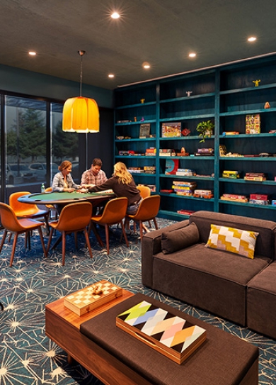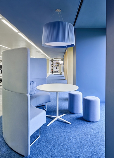 標(biāo)簽: 石材展廳裝修設(shè)計(jì)方案 簡約風(fēng)展廳裝修案例 READ MORE項(xiàng)目位于西班牙巴塞羅Dau大樓的六樓,主要用于西班牙金融服務(wù)公司Caixabank的創(chuàng)新和營銷部門。整體辦公室裝修設(shè)計(jì)以藍(lán)、黃為主體配色,這來自于公司的形象標(biāo)識(shí),也最終成就了本案令人驚嘆的空間視覺效果。藍(lán)色是本案的重點(diǎn)色彩表達(dá),以最極致的方法呈現(xiàn)于會(huì)議室和休息區(qū)的墻面、頂面和地面,以色彩形成一個(gè)極具獨(dú)立性的空間。 頭腦風(fēng)暴室運(yùn)用輕柔的木飾面和淺色的地毯,來營造一個(gè)寧靜和舒適的空間氛圍。此