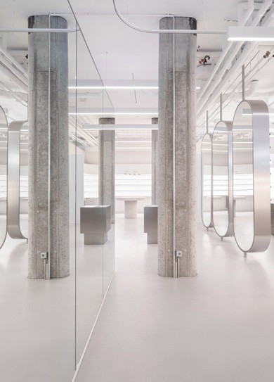 標(biāo)簽: 美發(fā)沙龍會(huì)所裝修設(shè)計(jì) 商業(yè)店面裝修案例 READ MOREBatek Architects為ZALANDO美容店打造了別具一格的室內(nèi)空間,并很快成為了受歡迎的“拍照打卡”地點(diǎn)。該商業(yè)空間可根據(jù)需求用作不同功能,為產(chǎn)品展示、活動(dòng)開(kāi)展、美容服務(wù)和視頻拍攝提供不同空間布局的可能性。可自由擺放的不銹鋼立方體在劃分空間的同時(shí)也為產(chǎn)品的陳列和展示提供了完美的平臺(tái)。下面就隨著鄭州商業(yè)店面裝修公司宏鈺堂小編一起去欣賞吧!長(zhǎng)長(zhǎng)的展示架是由Smile Plastics公司利